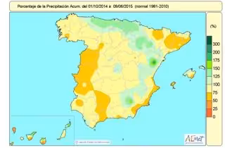 Las lluvias acumuladas en el conjunto de España desde que el 1 de octubre pasado comenzó el año hidrológico (que terminará el 30 de septiembre) ascienden a 469 litros por metro cuadrado, lo que representa un 13 por ciento menos que el valor medio normal para este periodo, que se sitúa en 536 litros por metro cuadrado.