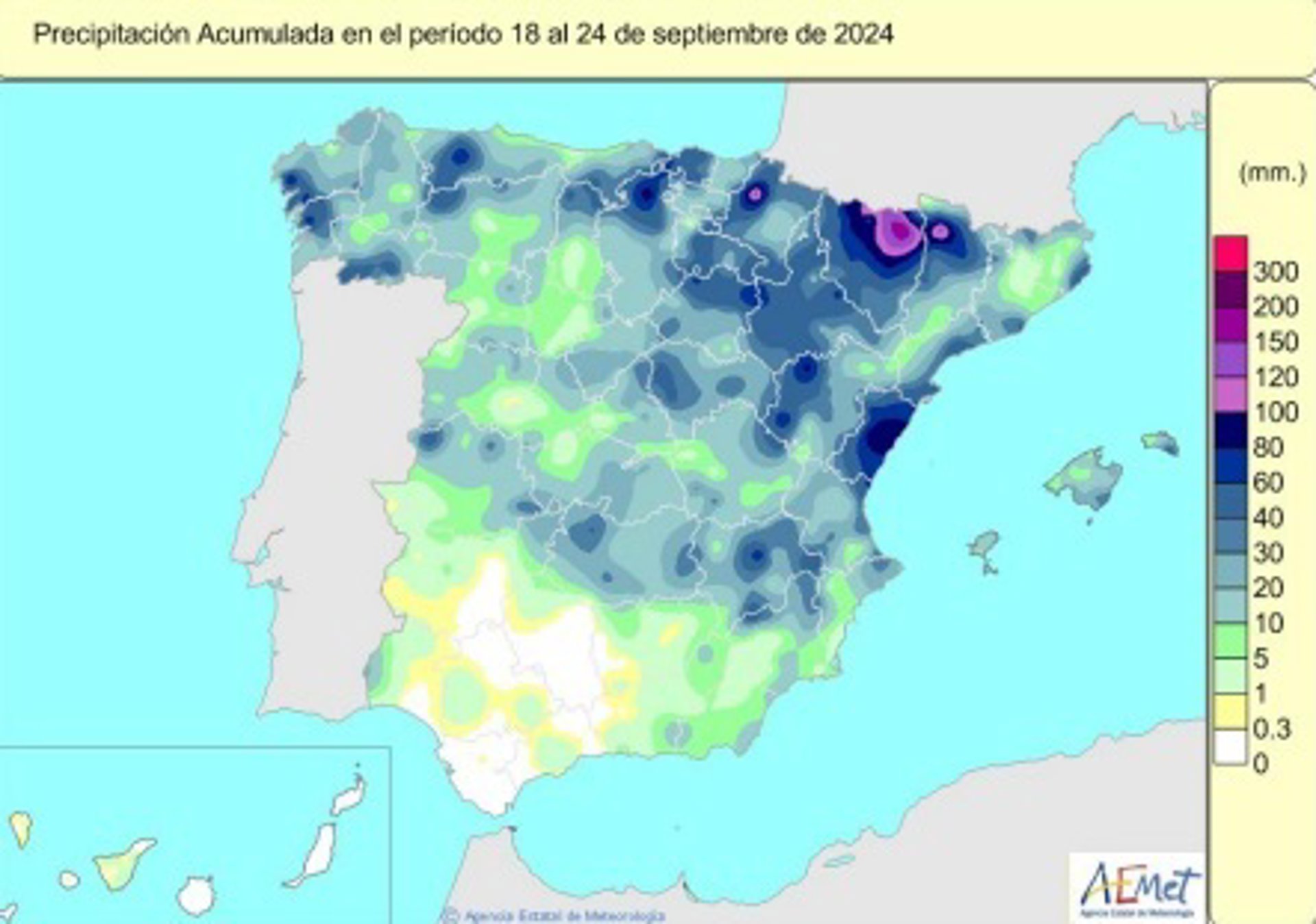 Así, el valor medio nacional de las precipitaciones acumuladas se cifra en 660 litros por metro cuadrado (l/m2) cuando el valor normal correspondiente a dicho periodo es de 629 l/m2. En la semana del 18 al 24 de septiembre, la agencia ha informado de que las precipitaciones fueron abundantes y afectaron a gran parte de la Península, especialmente a su interior y mitad norte, así como a Baleares. Por zonas, las cantidades más destacadas alcanzaron los 100 l/m2 en zonas del pirineo oscense y en el Prepirineo navarro e ilerdense. Además, se superaron los 60 l/m2 en la mitad norte de las provincias de Huesca y Lleida, en Castellón y en puntos más aislados de Teruel, Albacete, Burgos, País Vasco y Navarra.