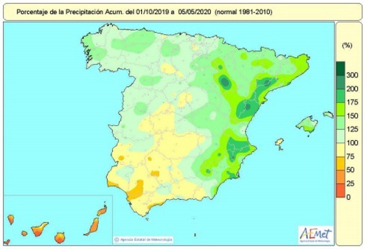 Las lluvias acumuladas en el año hidrológico, que comenzó el 1 de octubre de 2019, hasta el 5 de mayo de 2020 superan en un 17 por ciento el valor medio normal, ya que en este periodo se ha recogido 559 litros por metro cuadrado de precipitación cuando el valor normal son 476 litros por metro cuadrado.