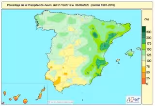Distribución de las lluvias acumuladas en España desde que comenzó el año hidrológico, el 1 de octubre de 2019, hasta el 5 de mayo de 2020. - AEMET