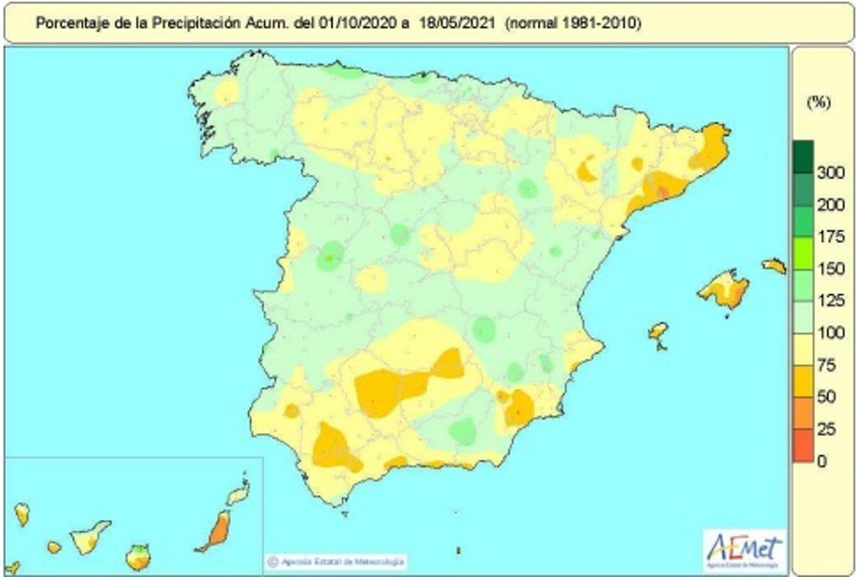 Precipitaciones acumuladas en el conjunto de España entre el 1 de octubre de 2020 y el 18 de mayo de 2021. - AEMET