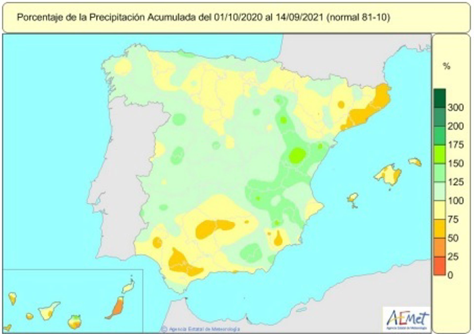 Mapa de lluvias acumuladas en España desde el 1 de octubre de 2020 hasta el 14 de septiembre de 2021. Se sitúan un 5% por debajo del valor normal a falta de 15 días para terminar el presente año hidrológico. - AEMET
