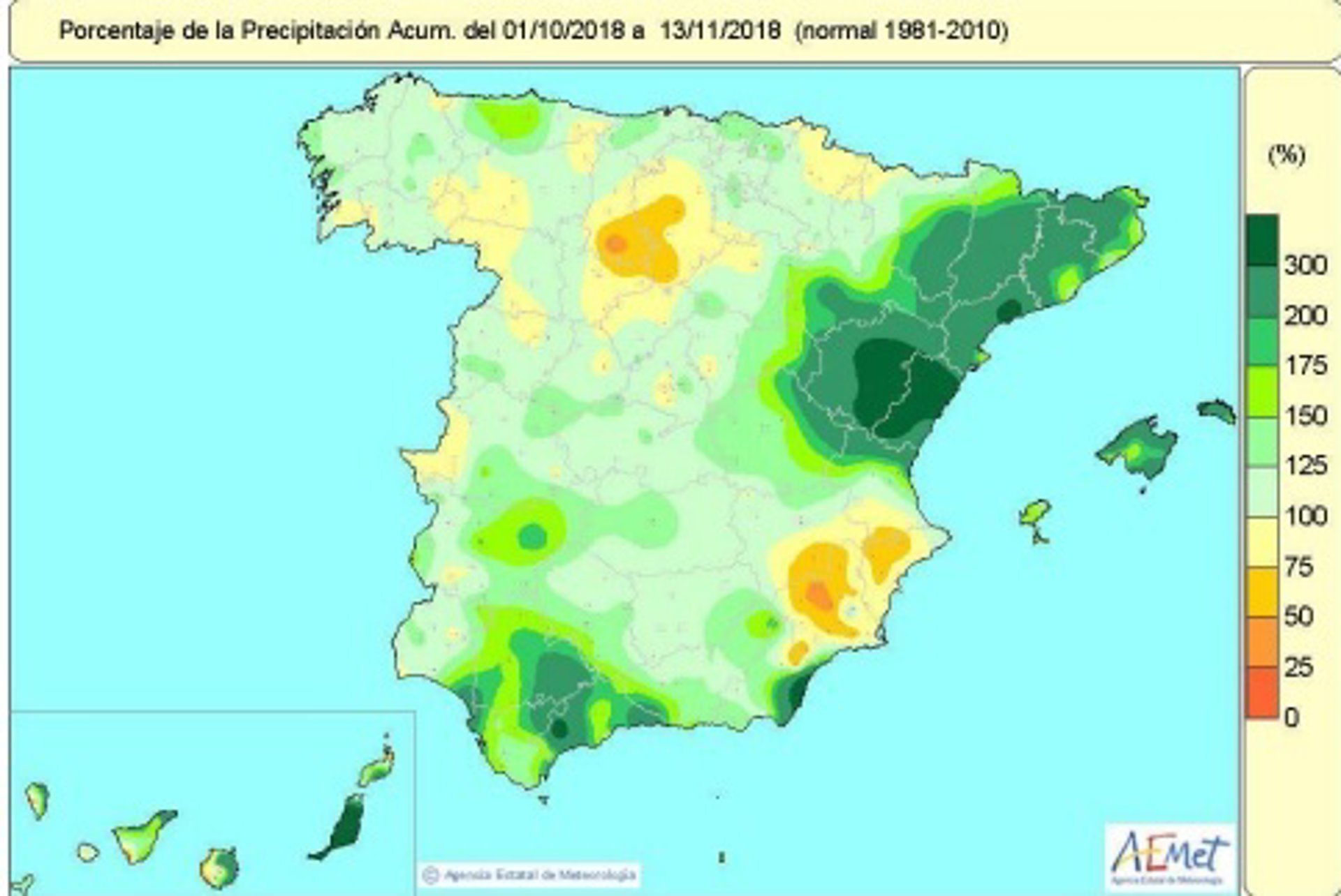Las precipitaciones acumuladas desde el 1 de octubre, cuando comenzó el año hidrológico, hasta el 13 de noviembre, han alcanzado un valor de 148 litros por metro cuadrado, lo que representa un 35 por ciento más que el valor medio normal que correspondería al conjunto de España en este periodo, que son 110 litros por metro cuadrado, según la Agencia Estatal de Meteorología (AEMET).