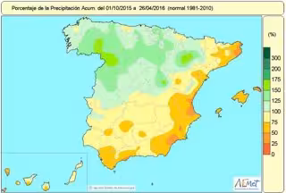 La portavoz de la AEMET, Ana Casals, ha señalado a Europa Press que el valor medio nacional de las precipitaciones acumuladas desde el pasado 1 de octubre hasta el 26 de abril han alcanzado una cifra de 468 litros por metro cuadrado, un dos por ciento por encima del valor normal correspondiente a este periodo (457 litros por metro cuadrado).
