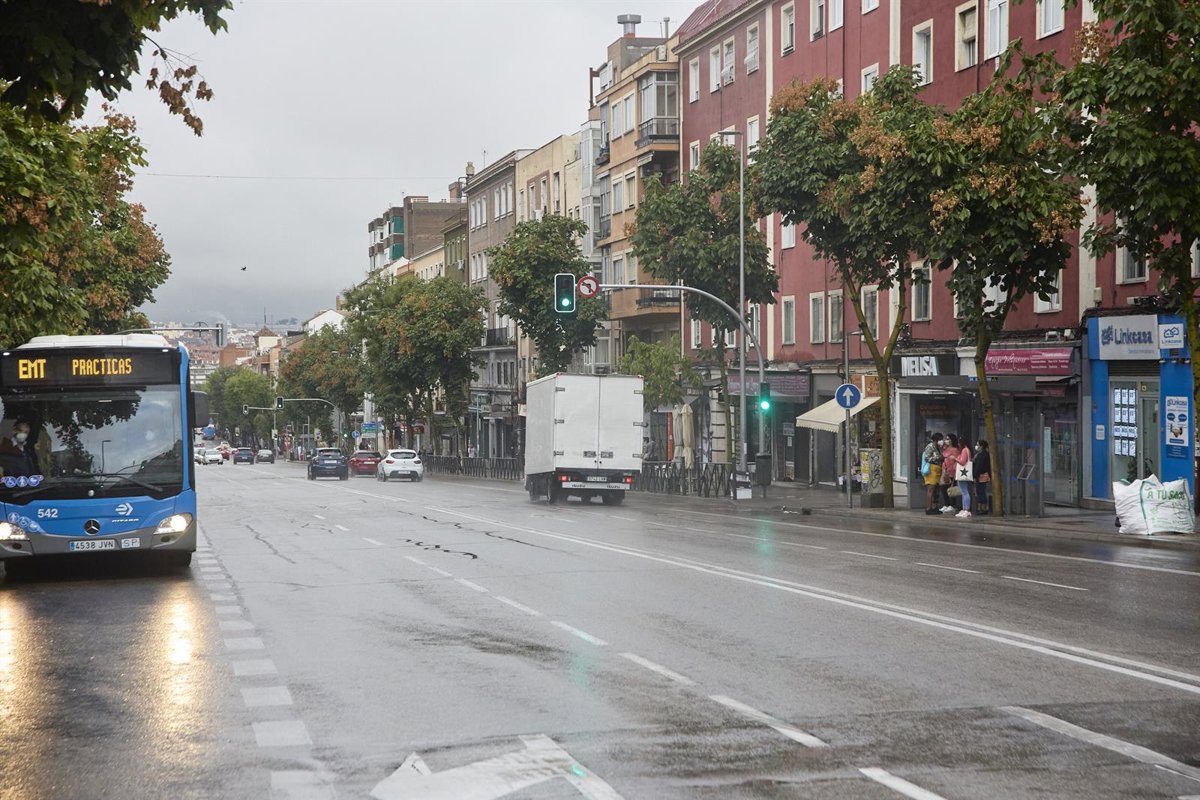 Un autobús de la EMT en prácticas pasa por una calle mojada por la lluvia, a 15 de septiembre de 2022, en el distrito de Carabanchel, en Madrid (España). Las precipitaciones producidas por la borrasca Danielle en la Comunidad de Madrid se van a intens - Jesús Hellín - Europa Press