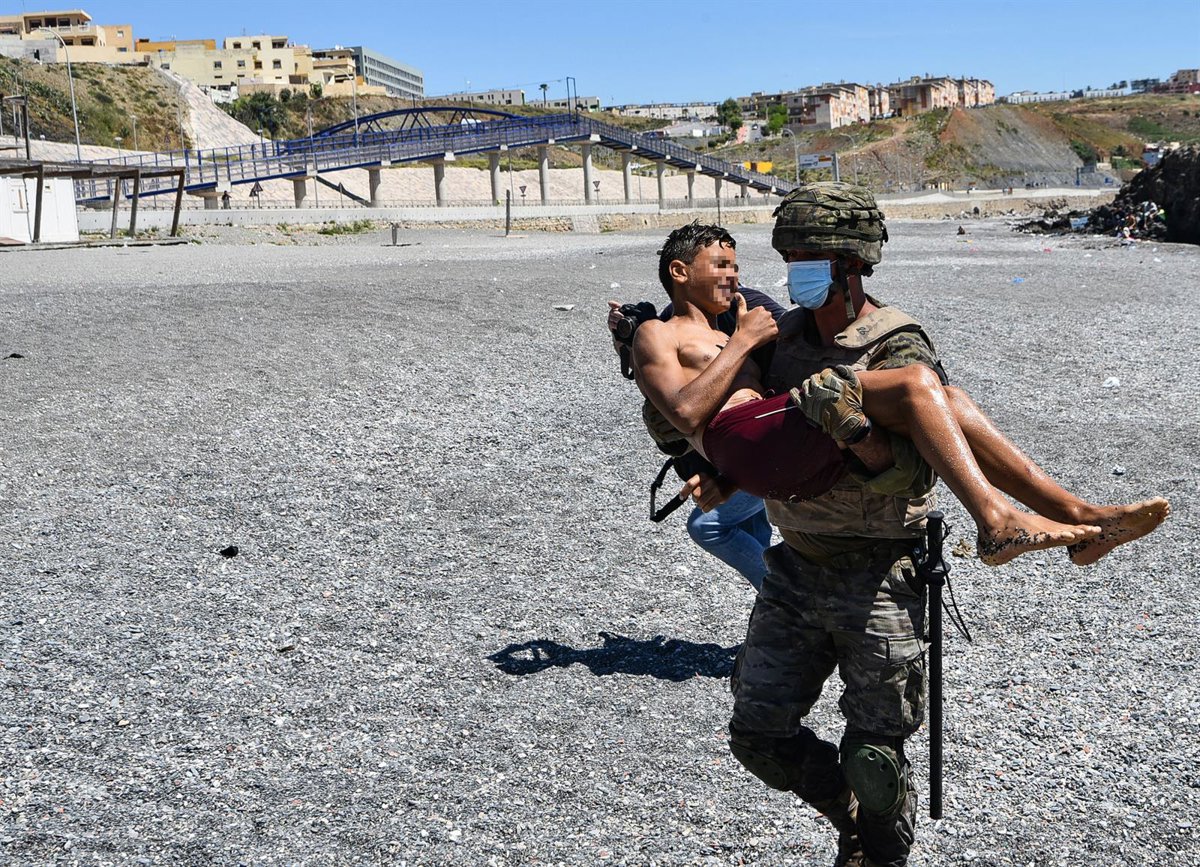 Un militar del ejército español ayuda a un menor migrante procedente de Marruecos a su llegada a Ceuta. - Antonio Sempere - Europa Press