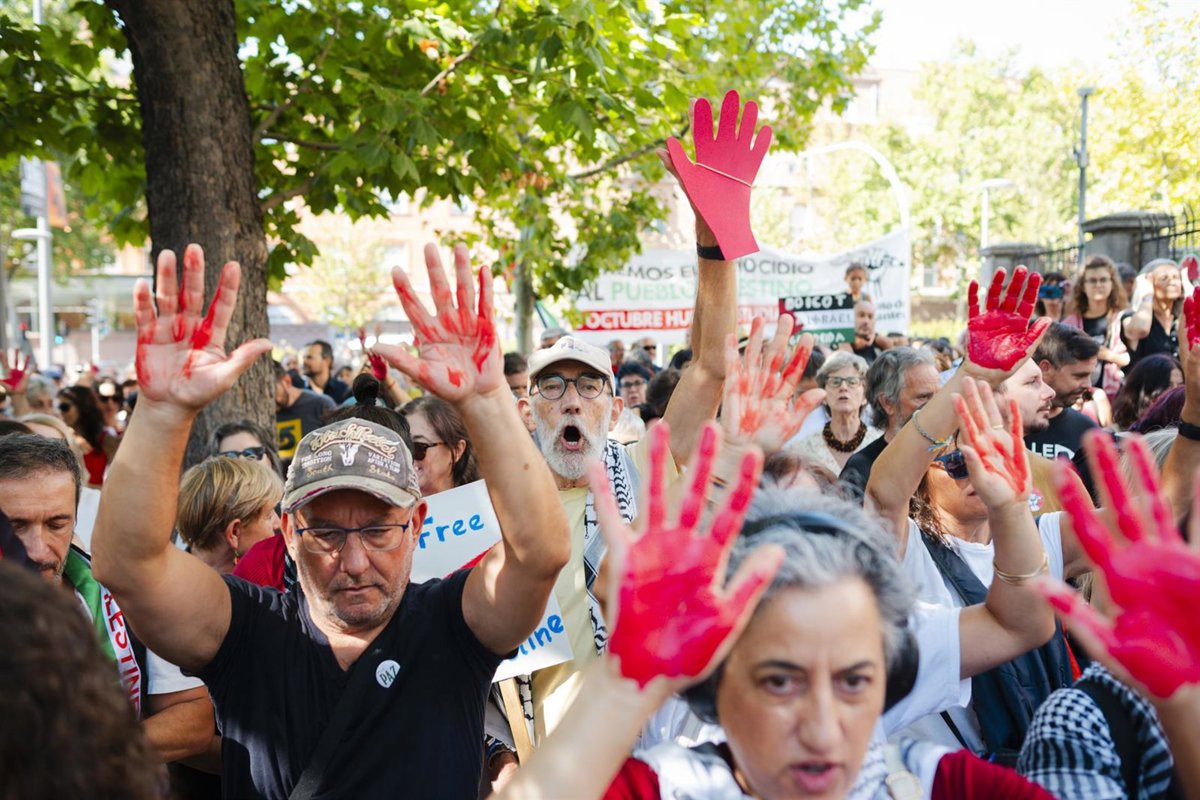 Un grupo de personas durante una concentración propalestina, frente a la embajada de Israel, a 6 de septiembre de 2025, en Madrid (España). - Mateo Lanzuela - Europa Press