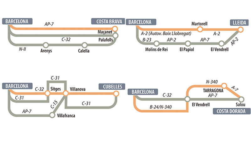 Las rutas desde Barcelona para llegar a la Costa Brava, Cubelles, Costa Dorada y Lleida.