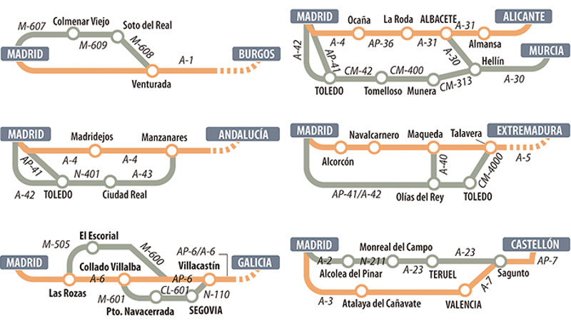 Estos son los itinerarios alternativos propuestos por la DGT para ir desde Madrid a Burgos, Andalucía, Galicia, Alicante, Murcia, Castellón y Extremadura.