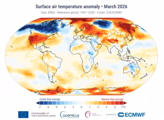 Marzo de 2026 fue el cuarto marzo más cálido jamás registrado a nivel mundial y el segundo en Europa, según ha señalado este viernes el Servicio de Cambio Climático de Copernicus (C3S). En concreto, la temperatura media del aire en superficie de 13,94°C, un total de 1,48 °C por encima de los niveles preindustriales.
