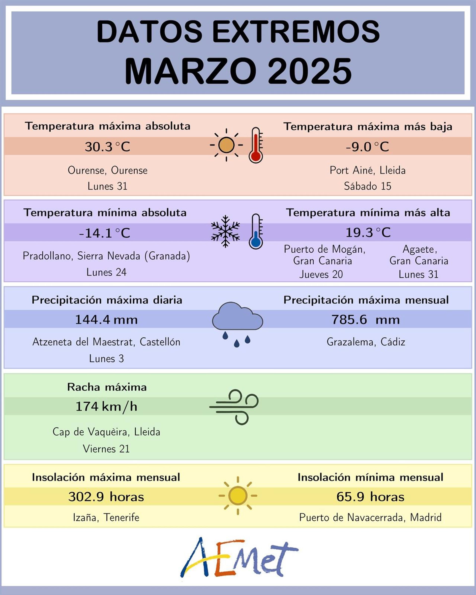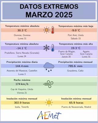 De acuerdo con un mensaje del organismo estatal en 'Threads', la racha máxima de viento del mes se registró en Cap de Vaquèira el viernes 21: 174 kilómetros por hora (km/h). Al margen de ello, la temperatura máxima absoluta se localizó en Ourense (Galicia), donde los termómetros marcaron 30,3ºC el lunes 31.