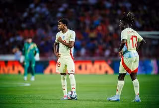 Los jugadores de la selección española Lamine Yamal y NIco Williams, ante Serbia en la Liga de Naciones. - RFEF
