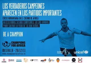 Más de 60 jugadores participarán este jueves en la cuarta edición de 'Champions for África', un partido solidario promovido por UNICEF, en colaboración con la Fundación Kanouté, que se disputará en el estadio de Mestalla (20.00 horas) con el objetivo de recaudar fondos para combatir la emergencia nutricional del Cuerno de África.