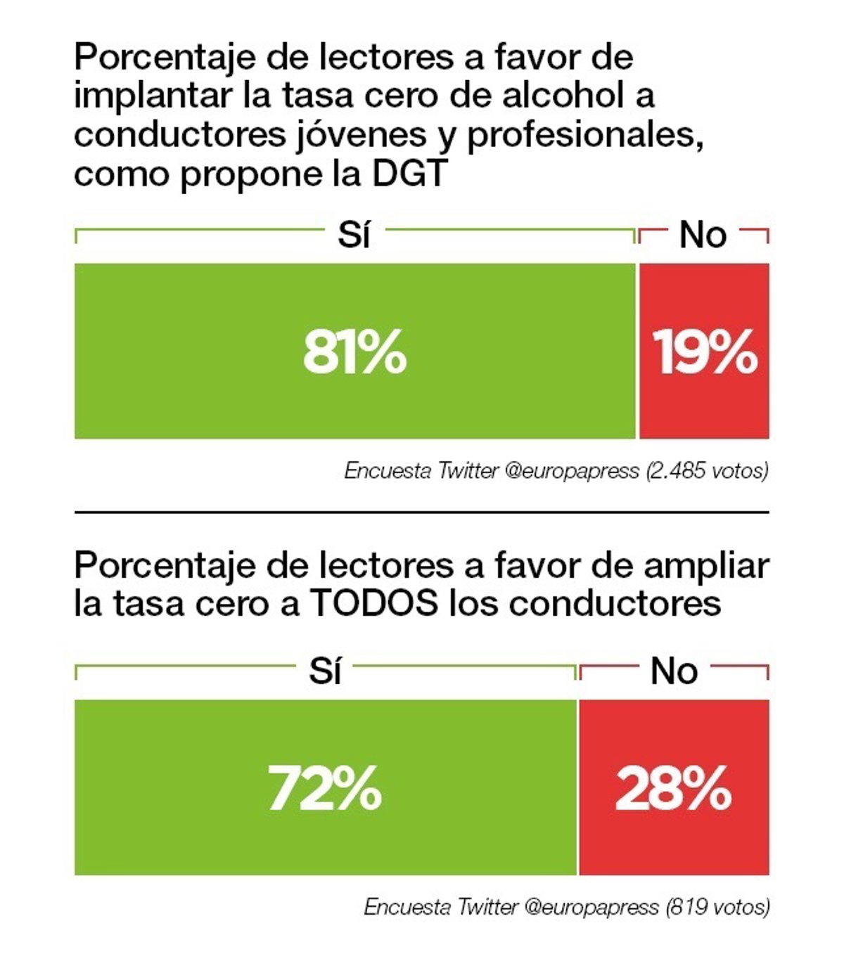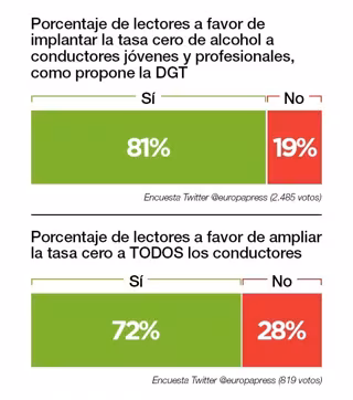 El 81% de los lectores que han participado en nuestra encuesta de Twitter están a favor de implantar la tasa cero de alcohol para conductores "jóvenes y profesionales" como propone la DGT mientras que un 72% apoya ampliar esta medida a todos los conductores.