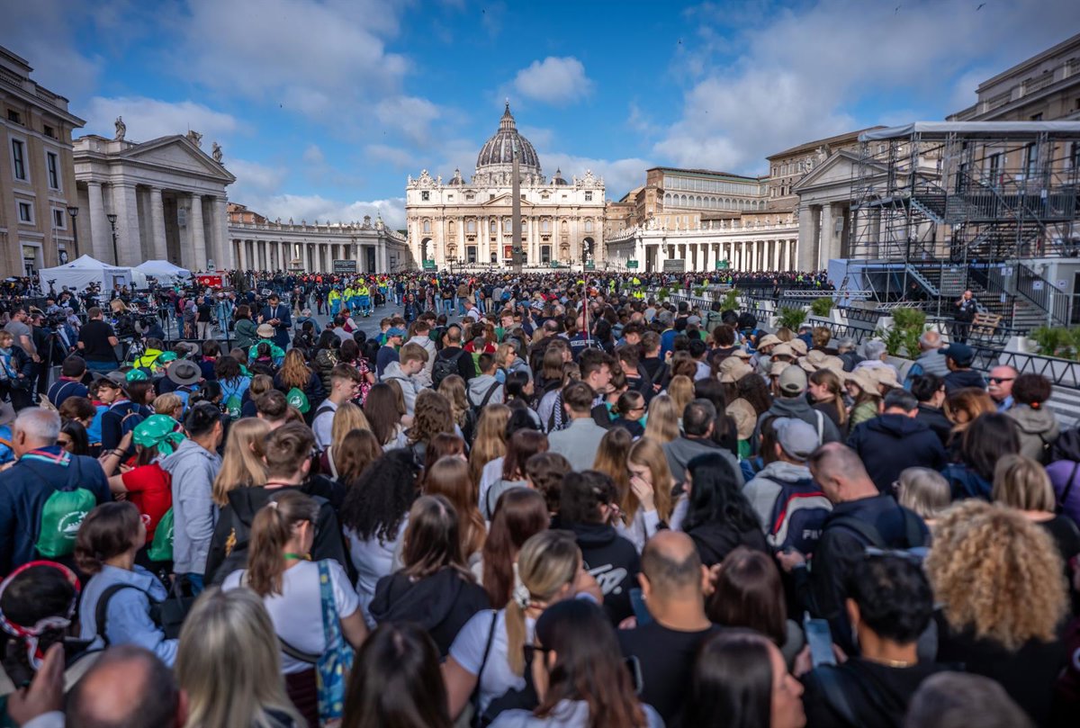 25 April 2025, Vatican, Vatican City: People queue in front of the St. Peter's Square to pay their respects as the body of Pope Francis lies in state inside St. Peter's Basilica. The Argentine pontiff, who leads the Catholic Church from 2013, dies on East - Michael Kappeler/dpa