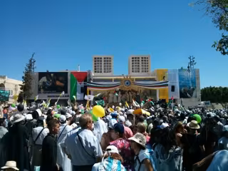 Dos banderas gigantes, del Vaticano y otra palestina cuelgan del ayuntamiento de Belén y un cartel que cuelga de una mezquita reza: 'Bienvenido a Palestina'. En la Plaza se escuchan helicópteros y todas las miradas se elevan para contemplar la llegada a Belén de Francisco. Todos gritan de emoción a falta de unas dos horas para la misa, y esperan en sillas o de pie protegidos del intenso sol de este domingo con gorras, pañuelos e incluso paraguas.