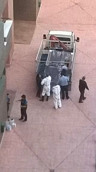 Operarios de la Comunidad de Madrid se han desplazado hasta el domicilio de la enfermera infectada por ébola para trasladar a su perro, como se observa en estas imágenes tomadas desde la urbanización en la que vive la pareja, a las que ha tenido acceso Europa Press.