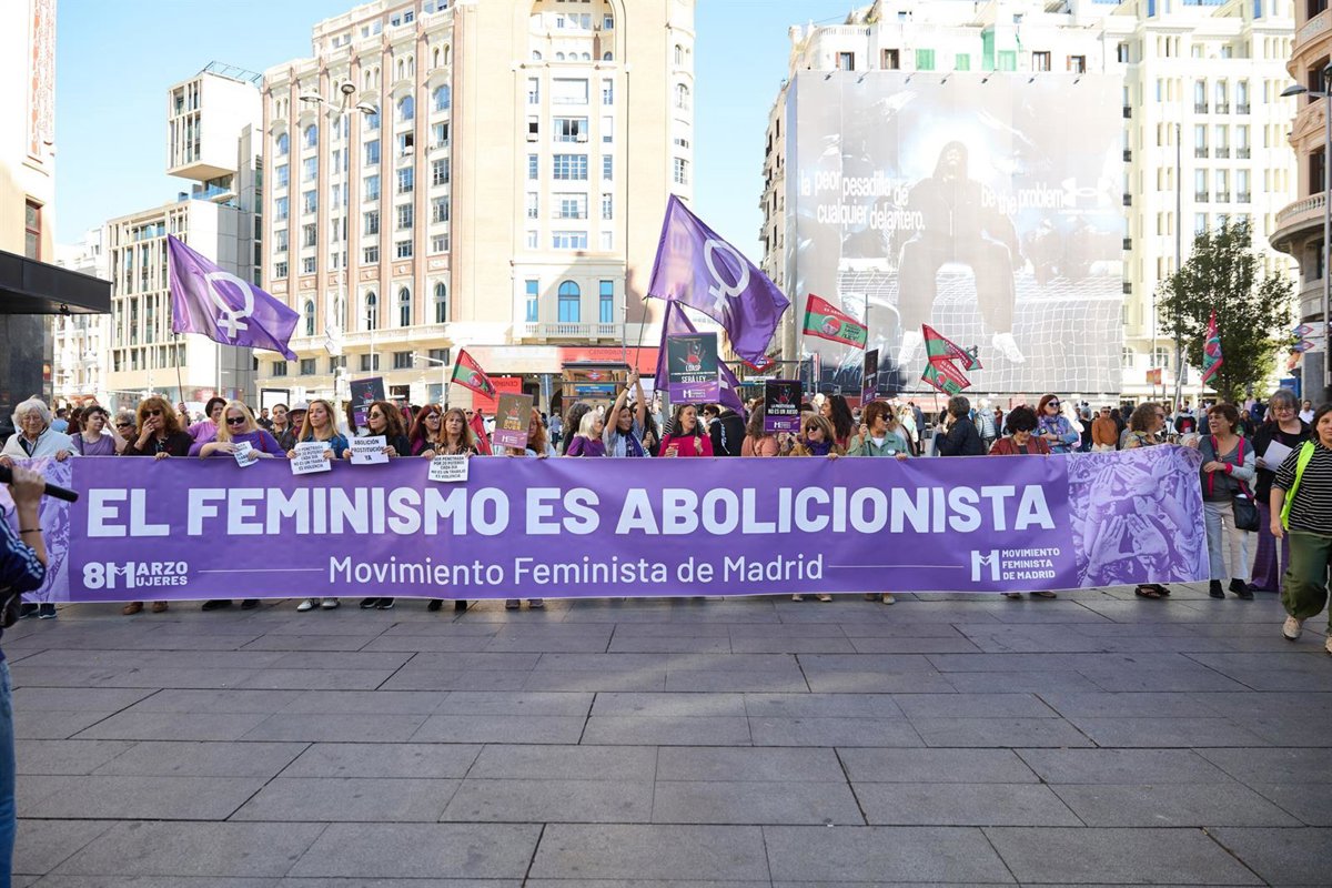 Manifestantes sosteniendo una pancarta con el lema 'El feminismo es abolicionista" durante la concentración convocada por el Movimiento Feminista de Madrid (MFM) para pedir la abolición de la prostitución. - Jesús Hellín - Europa Press