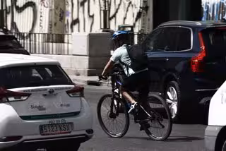 Archivo - Un ciclista monta en bicicleta entre coches en la Plaza de España en Madrid. - Eduardo Parra - Europa Press - Archivo