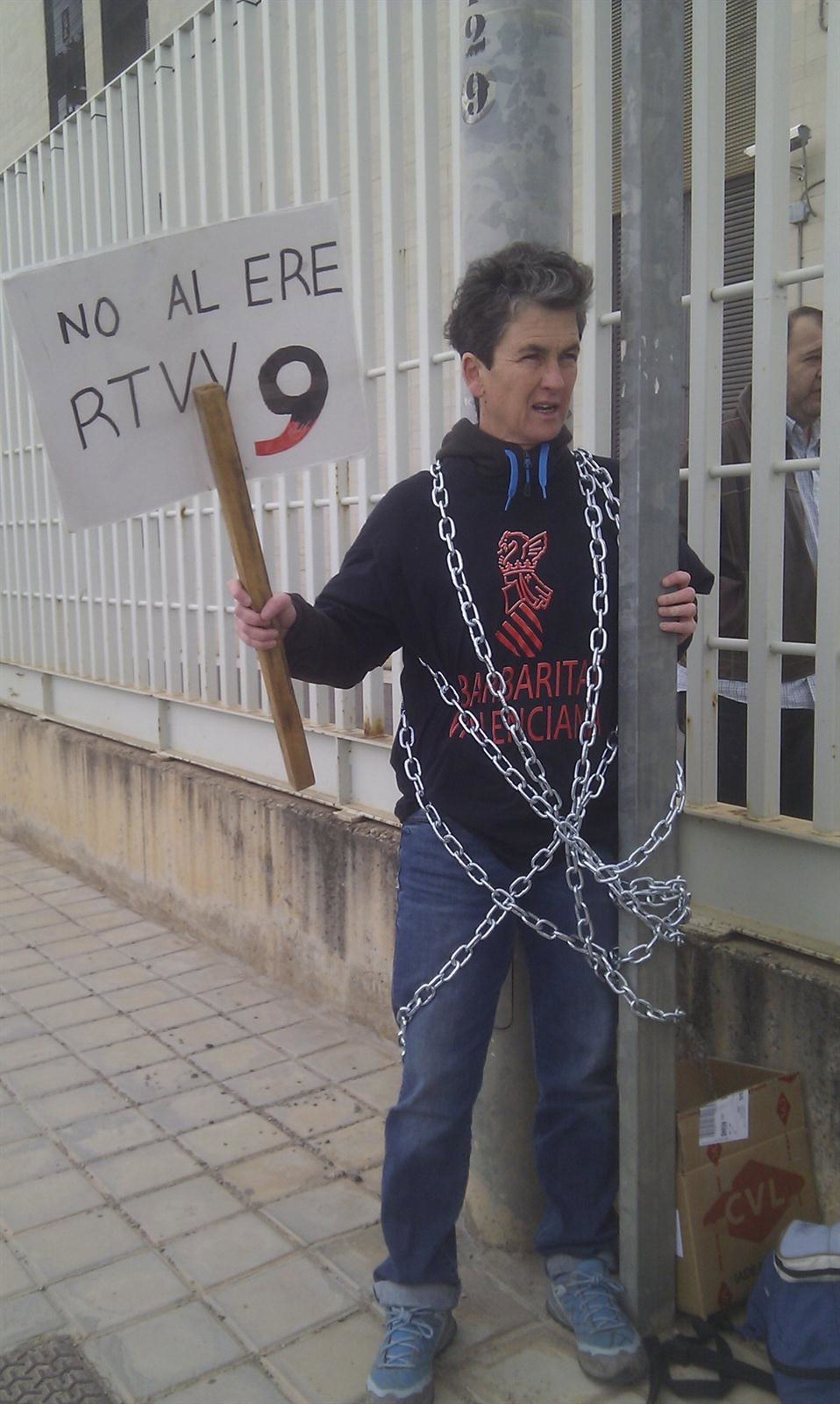 La mujer de un cámara de informativos de Canal 9, Isabel Benito, se ha encadenado este martes a la valla del centro de producciones y programas de Canal 9, en Burjassot (Valencia), para mostrar su rechazo al Expediente de Regulación de Empleo (ERE) en Radiotelevisión Valenciana (RTVV) y rechazar la "muerte de un modelo de televisión pública" y con ella la "muerte" de "valores importantes".