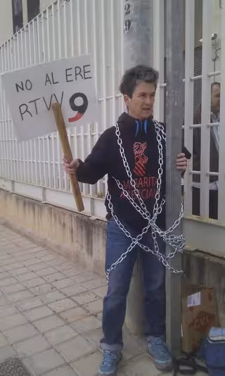 Ha comentado que permanecerá encadenada a la valla del centro de producciones y programas de Canal 9 en Burjassot "hasta el próximo viernes incluido" y que a partir de esa jornada acudirá a este lugar para secundar esta protesta "todos los días que tenga disponibles hasta que haya una reacción". La mujer muestra una pancarta en la que se puede leer por un lado 'Cría ricos y te comerás su crisis' y, por otro, 'No al ERE en RTVV'.