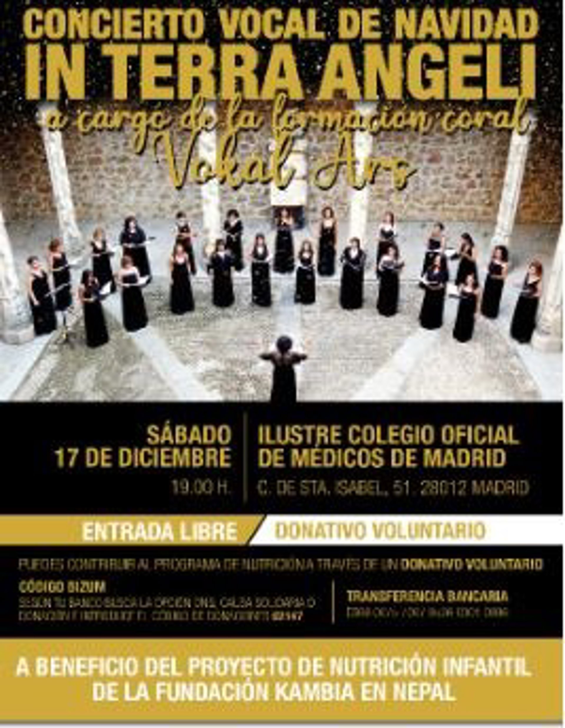 derechos de las mujeres, las niñas y los niños, celebra junto a VokalArs un concierto de Navidad gratuito el próximo sábado 17 de diciembre en Madrid, cuyo objetivo es recaudar fondos para el programa de nutrición infantil de los Sukumbasi en Nepal.
