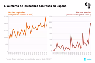El análisis observa que las noches tórridas se han multiplicado por cinco desde la media histórica observada entre 1991-2020. En concreto, durante 2023 se han contabilizado 240 noches tórridas frente a las 179 de 2022.