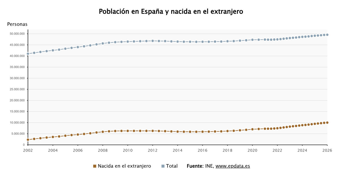 La población residente en España aumentó en 81.520 personas en el cuarto trimestre de 2025 y se situó en 49.570.725 habitantes a 1 de enero de 2026, lo que supone el valor máximo de la serie histórica, debido al incremento de los nacidos en el extranjero que superaron por primera vez los 10 millones.