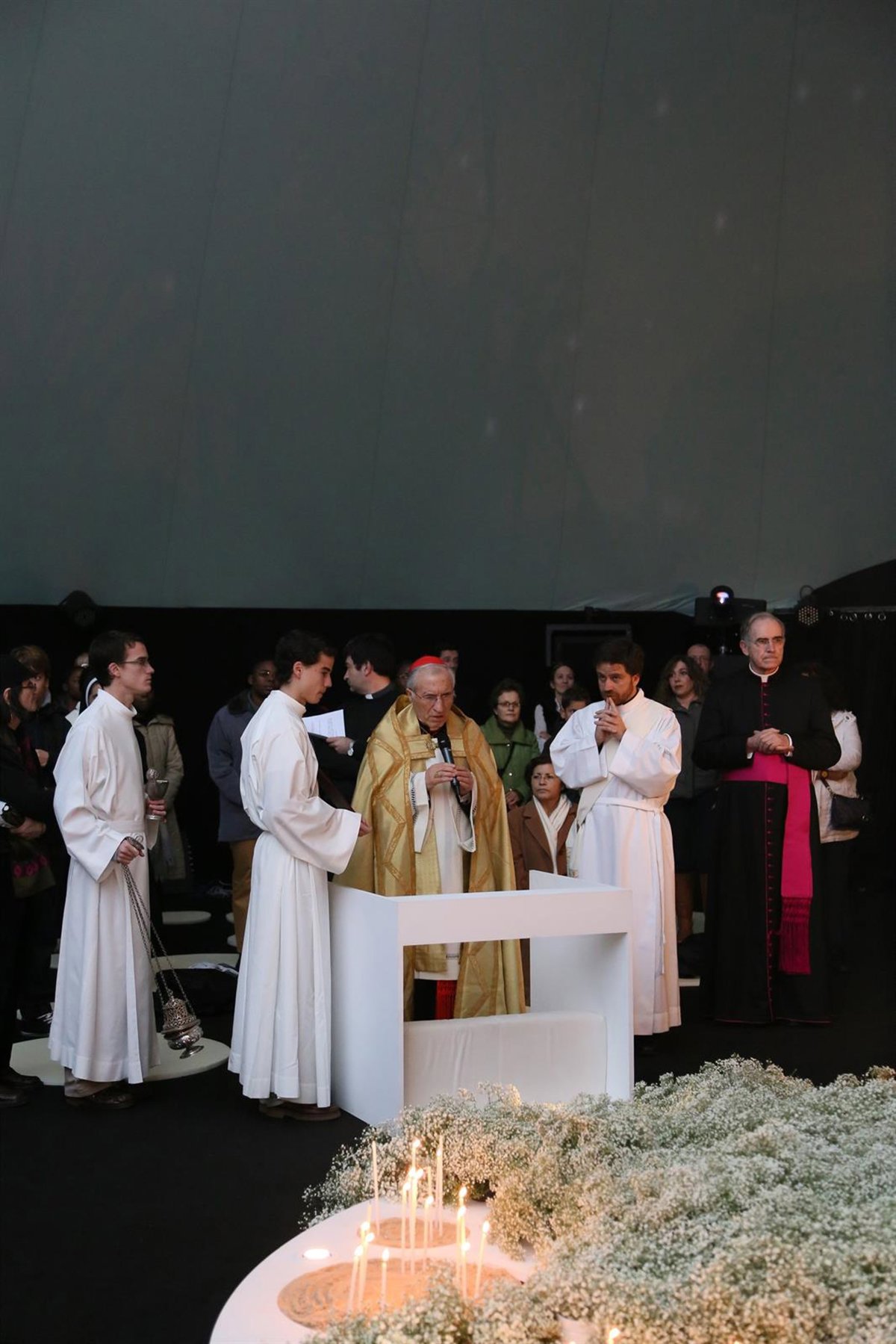 Rouco Varela inauguró este viernes por la tarde la Fiesta de la Sagrada Familia con la exposición del Santísimo Sacramento en 'El Faro Eucarístico', estructura gentileza del arquitecto Eduardo Delgado y Granda, diseñada para crear esta capilla en el interior del Domo, de los Jardines del Descubrimiento.