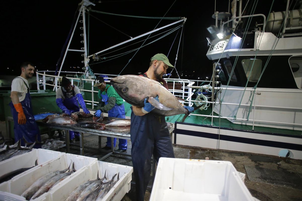 Los marineros del barco y los trabajadores de la lonja descargan las piezas del túnido durante una descarga de bonito en el Puerto de Burela, en Lugo, Galicia (España). - Carlos Castro - Europa Press