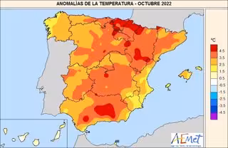 De este modo, el mes de octubre de 2022 fue, en el conjunto de España, extremadamente cálido. La anomalía de temperatura del mes fue muy excepcional y los 3,6C de aumento es el mayor incremento registrado en cualquier mes del año, empatado con mayo de 1964. Desde el inicio de la serie histórica, en 1961, solo siete meses han tenido una anomalía de temperatura de 3C o más, cinco de ellos registrados desde 2011 y cuatro de ellos, desde 2017: junio de 2017, febrero de 2020, mayo de 2022 y octubre de 2022.