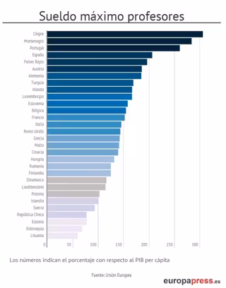 Muy lejos de estas cantidades se sitúan los países cuyos sueldos máximos son los más altos de entre los sistemas educativos estudiados: Chipre (205,6%), Montenegro (283,7%) y Portugal (283,7% de la renta per cápita).