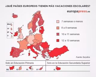 Las vacaciones de verano en Europa varían significativamente de un país a otro, desde las seis semanas de algunas regiones alemanas, Holanda o Reino Unido hasta las 13 semanas de Italia, Letonia o Turquía, según el último informe sobre el año escolar de Eurydice, Red europea de información sobre Educación.