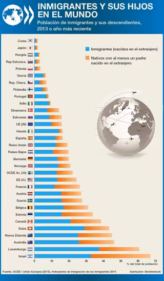 En su último informe Indicadores de la Integración de Inmigrantes 2015, la Organización para la Cooperación y el Desarrollo (OCDE) ha analizado qué países son aquellos que tienen una mayor población de inmigrantes nacidos dentro de sus fronteras, así como el volumen de población de inmigrantes de segunda generación --hijos de inmigrantes--. El resultado es este gráfico.