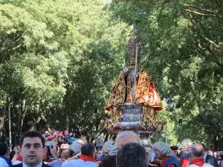 Desde la iglesia de San Lorenzo, la procesión ha comenzado el trayecto por el Rincón de la Aduana para adentrarse en la calle San Antón, rebosante de pamploneses vestidos de rojo y blanco, que la han recibido con sonoras ovaciones, dando color a los balcones y a las calles del Casco Antiguo.