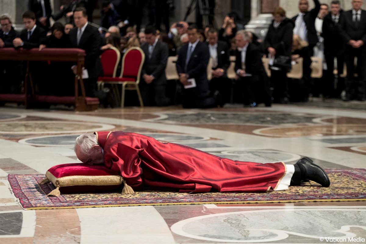 El Papa Francisco ha rezado este Viernes Santo 30 de marzo durante varios minutos postrado sobre el pavimento de la Basílica de San Pedro frente al crucifijo situado en el altar de la Cátedra de San Pedro antes de la ceremonia en la que se recuerda la crucifixión de Jesucristo.