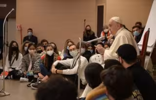 El Pontífice llegó este jueves al Pontificio Collegio Internazionale Maria Mater Ecclesiae (Roma) donde los jóvenes se encuentran conviviendo. Allí fue recibido por ellos acompañados de los fundadores de Scholas, José María del Corral y Enrique Palmeyro, y el ministro de educación de Italia, Patrizio Bianchi, entre otras autoridades presentes.