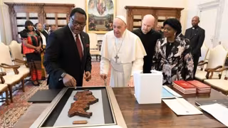 Por su parte, McCarthy Chakwera ha entregado a Francisco un relieve en madera esculpido por artesanos locales, que representa el mapa de Malawi con las principales ciudades indicadas y animales que habitan el país.