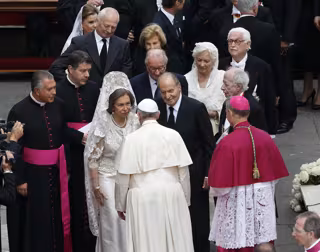 Doña Sofía vestido de largo blanco con mantilla y peineta, como corresponde a las reinas católicas, y Don Juan Carlos, de traje oscuro con la insignia de la Orden Piana (Pio IX), máxima condecoración pontificia, que reconoce las mejores relaciones de los Estados con Vaticano y que le fue concedida al monarca español, según informa la Casa Real. También vestían de blanco la reina de Bélgica y la Gran Duquesa de Luxemburgo.