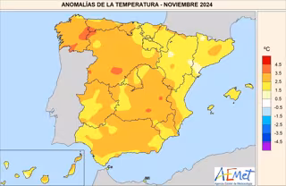 Anomalías de la temperatura en noviembre de 2024 respecto al promedio 1991-2020. - AEMET / MITECO