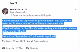 El presidente Pedro Sánchez ha expresado a través de Twitter su solidaridad con Asturias y ha pedido precaución ante los más de 100 incendios que permanecen activos en la comunidad autónoma, después de hablar con el jefe del ejecutivo asturiano, Adrián Barbón.