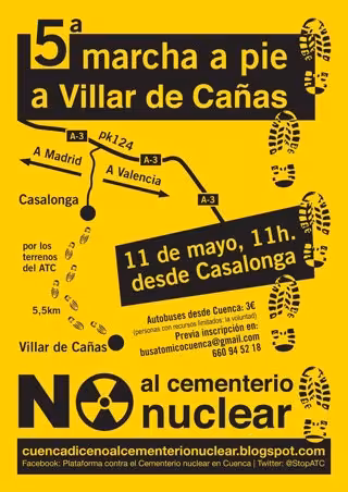 La Plataforma Contra el Cementerio Nuclear en Cuenca ha organizado autobuses para participar este viernes, 11 de mayo, en la 'Quinta marcha a pie a Villar de Cañas' para rechazar la instalación del Almacén Temporal Centralizado (ATC) en esta localidad conquense.