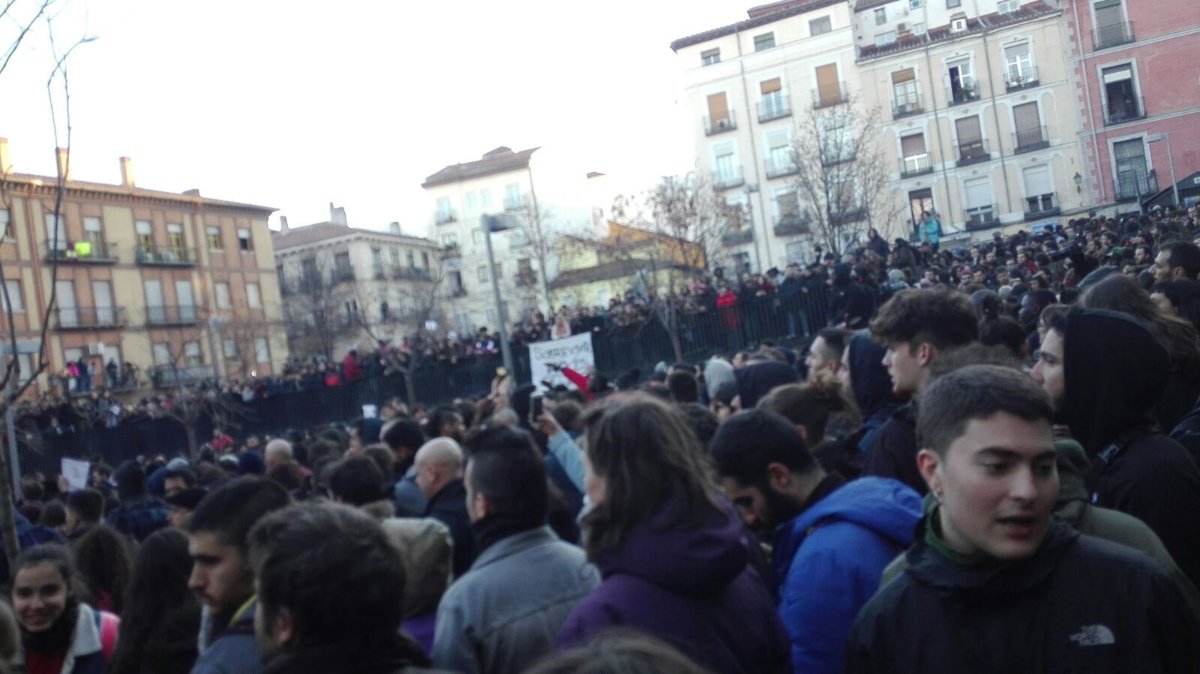 La plaza está con centenares de personas, que según fuentes presenciales, podrían superar los dos millares, que están gritando "justicia" por la muerte del mantero y rechazan la Ley de Extranjería. También se escucha "Madrid será la tumba del fascismo" y el clásico "Televisión, manipulación".