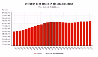 La población de España aumentó en 598.634 habitantes durante 2022 y se superó por primera vez los 48 millones (48.085.361 personas )a 1 de enero de 2023, según los primeros resultados del Censo de Población publicados por el Instituto Nacional de Estadística (INE). Este incremento se debió sobre todo a los extranjeros, cuyo número creció en 580.574 personas, hasta superar por primera vez los seis millones (en concreto, ascienden a 6.089.620).
