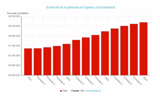 La población residente en España aumentó en 82.346 personas en el primer trimestre, situándose en un nuevo máximo histórico al alcanzar los 48.692.804, según la Encuesta Continua de Población.