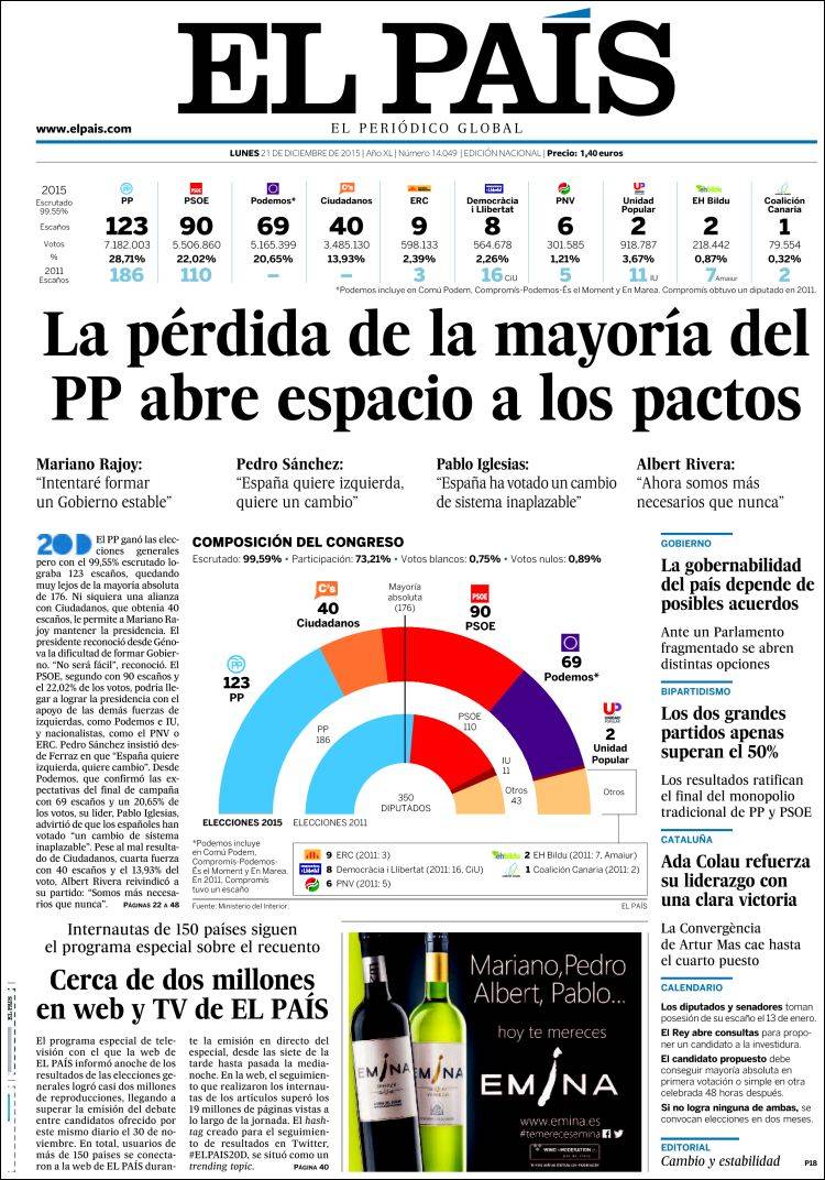 EL PAÍS: "La pérdida de la mayoría del PP abre espacio a los pactos". "La gobernabilidad del país depende de posibles acuerdos". "Los dos grandes partidos apenas superan el 50%".