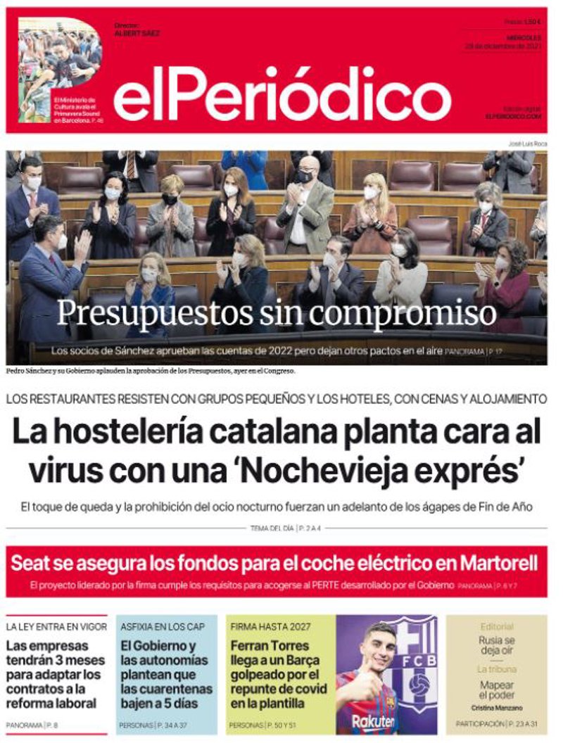 EL PERIÓDICO: "La hostelería catalana planta cara al virus con una 'Nochevieja exprés'"; "Seat se asegura los fondos para el coche eléctrico en Martorell"; "Las empresas tendrán 3 meses para adaptar los contratos a la reforma laboral"; "El Gobierno y las autonomías plantean que las cuarentenas bajen 5 días"; "Ferran Torres llega a un Barça golpeado por el covid en la plantilla".