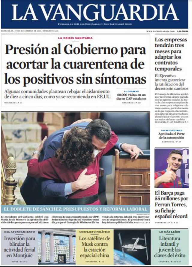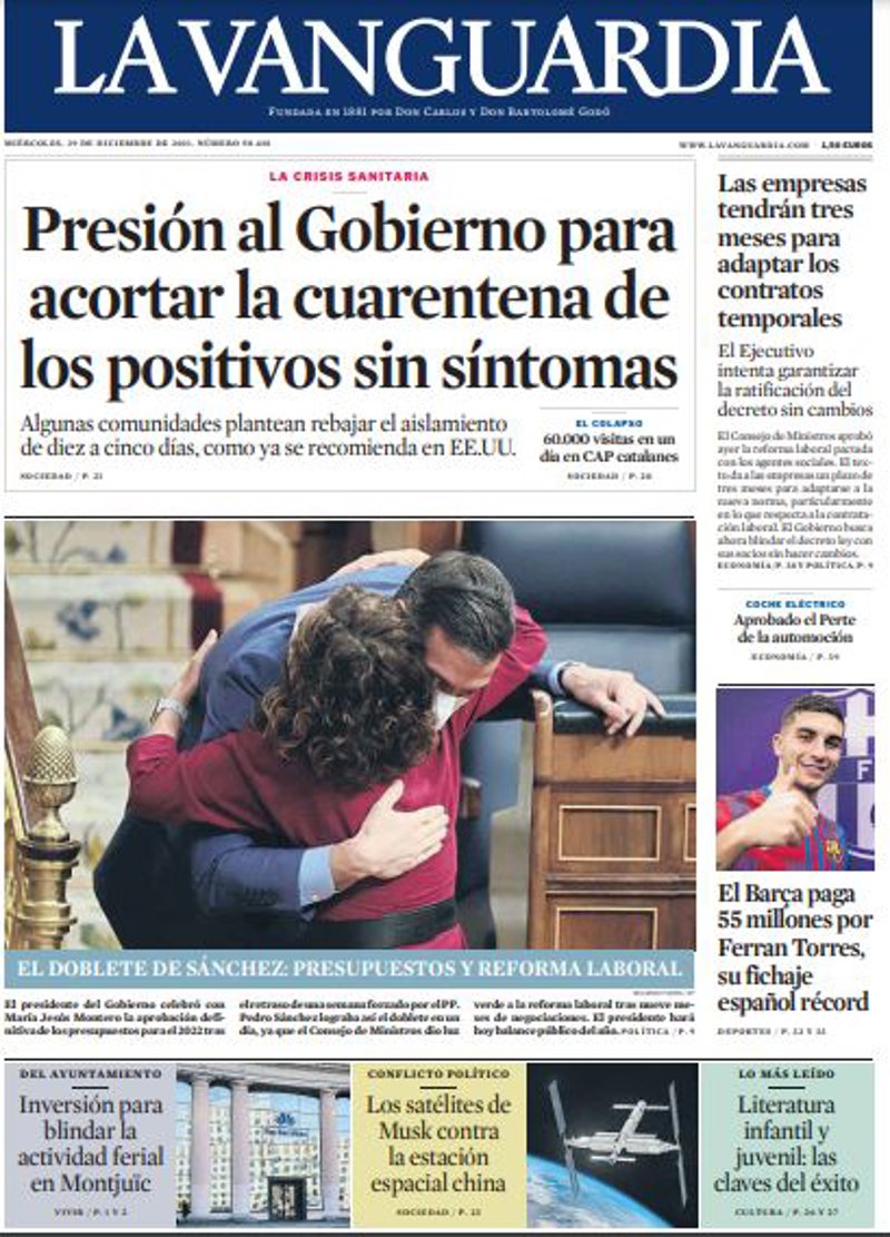 LA VANGUARDIA: "Presión al Gobierno para acortar la cuarentena de los positivos sin síntomas"; "Las empresas tendrán tres meses para adaptar los contratos temporales"; "El Barça paga 55 millones por FerranTorres, su fichaje español récord".