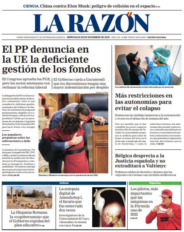 LA RAZÓN: "El PP denuncia en la UE la deficiente gestión de los fondos"; "Más restricciones en las autonomías para evitar el colapso"; "Bélgica desprecia a la Justicia española y no extraditará a Valtònyc".
