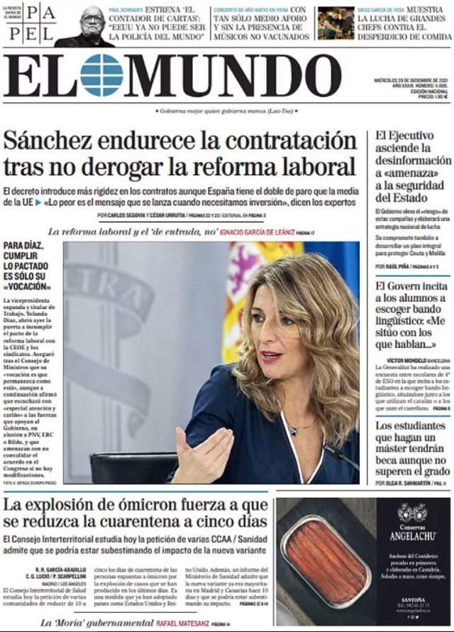 EL MUNDO: "Sánchez endurece la contratación tras no derogar la reforma laboral"; "La exposición de ómicron fuerza a que se reduzca la cuarentena a cinco días"; "El Ejecutivo asciende la desinformación a 'amenaza' a la seguridad del Estado"; "El Govern incita a los alumnos a escoger bando lingüístico: 'Me sitúo con los que hablan'"; "Los estudiantes que hagan un máster tendrán beca aunque no superen el grado".